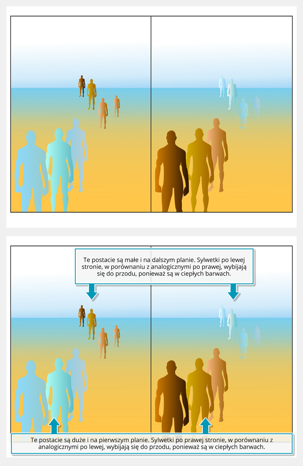 Ilustracja interaktywna przedstawia zasadę stosowania perspektywy barwnej. Grafika podzielona jest na dwie części. Na prawej znajduje się siedem postaci. Trzy pierwsze sylwetki są w odcieniach brązów i znajdują się na dole obrazu. Natomiast cztery kolejne są niebieskie i znacznie oddalone od pierwszych sylwetek. Na lewej części także znajduje się siedem sylwetek. Trzy pierwsze są w odcieniach niebieskich i znajdują się na dole obrazu. Natomiast cztery kolejne są w odcieniach brązu oraz znacznie oddalone od pierwszych sylwetek. Na ilustracji znajduje się niebieski kwadrat z literą „i”. Po odwróceniu ukazana jest ta sama grafika z komentarzami. Do górnej części odnosi się informacja: „Te postacie są małe i na dalszym planie. Sylwetki po lewej stronie, w porównaniu z analogicznym po prawej wybijają się do przodu, ponieważ są w ciepłych barwach”. Do dolnej części: „Te postacie są duże i na pierwszym planie. Sylwetki po prawej stronie w porównaniu z analogicznymi po lewej, wybijają się do przodu, ponieważ są w ciepłych barwach”.