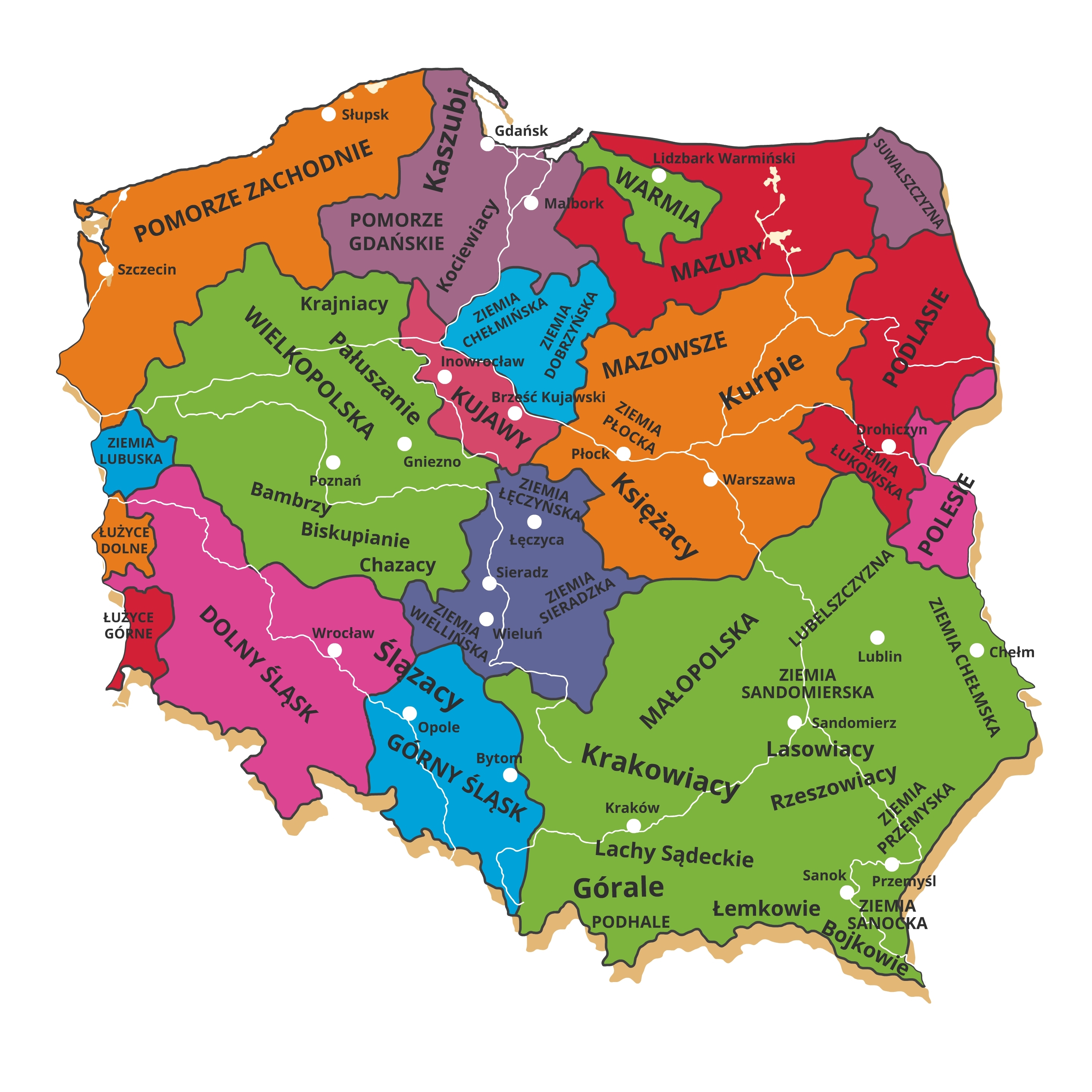 Zanim zaczniesz rozwiązywać zadania, odszukaj na mapie regiony, z których czerpał Szymanowski i dowiedz się więcej na temat ich folkloru. Będą to: Podhale, Kurpie, Mazowsze i Kujawy.