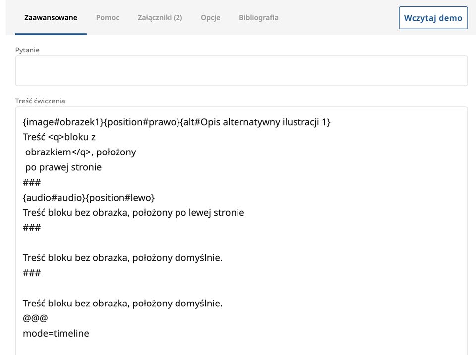 Modyfikatory: {image#nazwa_obrazka} - dodaje obraz do bloku.{audio#nazwa_audio} - dodaje plik audio do bloku.{embed#id} - dodaje zasób do bloku (po zdefiniowaniu można wgrać dowolny zasób, przede wszystkim wideo - razem z możliwością dodawania audiodeskrypcji);{position#lewo} - ustawia blok po odpowiedniej stronie prawo/lewo. {caption#Podpis pod obrazkiem} - dodaje podpis obrazka. {alt#Podpis alternatywny} - dodaje opis WCAG.{licence#Podpis licencyjny} - dodaje podpis licencyjny pod obrazkiem. {placeholder#Tekst przycisku#Treść placeholdera#Tytuł placeholdera} - dodaje białą aplę zasłaniającą blok - dopiero po kliknięciu na przycisk na niej pojawia się treść bloku.
