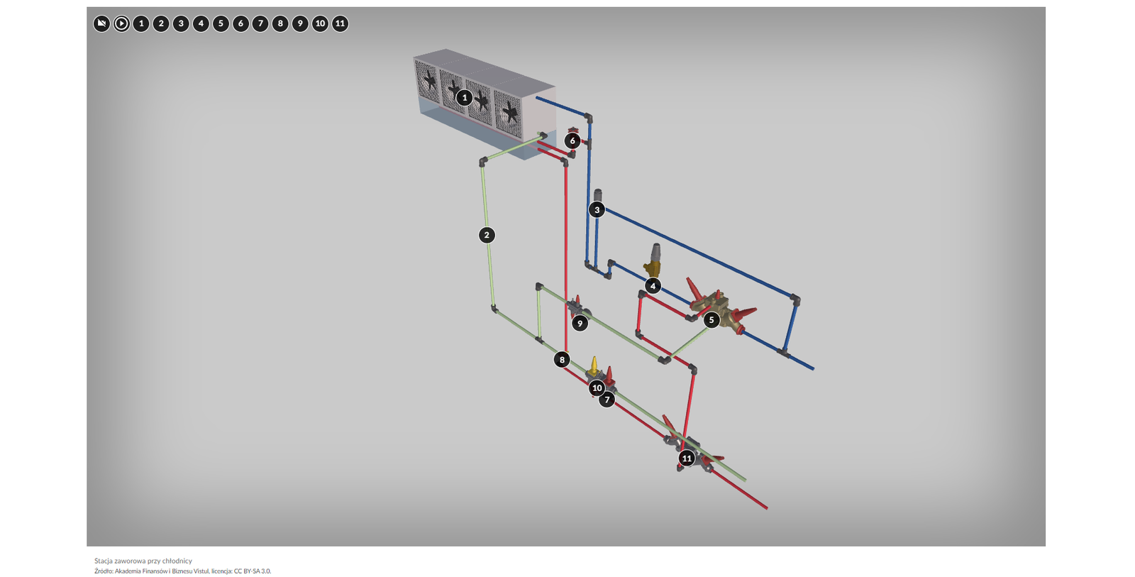 Po kliknięciu pojawia się plansza z pierwszym modelem a po kliknięciu na model obok rozwija się slajd z nagraniem dźwiękowym i treścią objaśnień. Model możemy dowolnie obracać, przybliżać, oddalać za pomocą myszki. Na poszczególnych częściach urządzenia widoczne są przyciski. Przyciski znajdują się również w lewym górnym rogu planszy. Oprócz numerów od 1 do 11, tożsamych z tymi na planszy, widoczne są dwie ikony – od lewej: Okrągły przycisk z przekreślonym znakiem kamery: zresetuj kamerę, obok okrągły przycisk ze znaczkiem plej: Zatrzymaj kamerę.