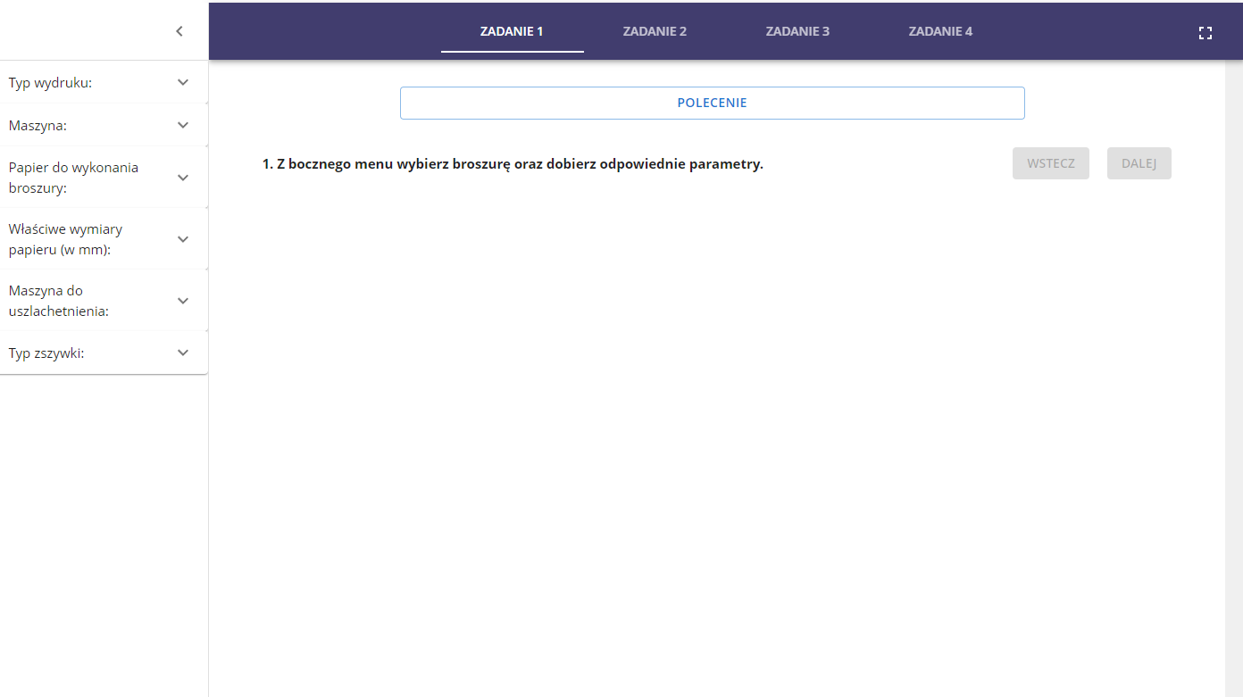 Poniżej górnej belki znajduje się przycisk „Polecenie”, po kliknięciu na który pojawia się opis kolejnych kroków do wykonania. W dolnym pasku ekranu znajdują się ikony: „Instrukcja” programu ćwiczeniowego – zawierająca wszystkie instrukcje techniczne niezbędne do korzystania z programu ćwiczeniowego; ikona „Baza wiedzy”, ikona „Zapisz efekty pracy”, ikona „Pobierz listę kroków”, która w dowolnym momencie umożliwia zapisanie postępów pracy i pobranie pliku na komputer, ikona „Zrzut ekranu” oraz ikona „Spróbuj ponownie”, która umożliwia wykonanie ponownie ćwiczenia.