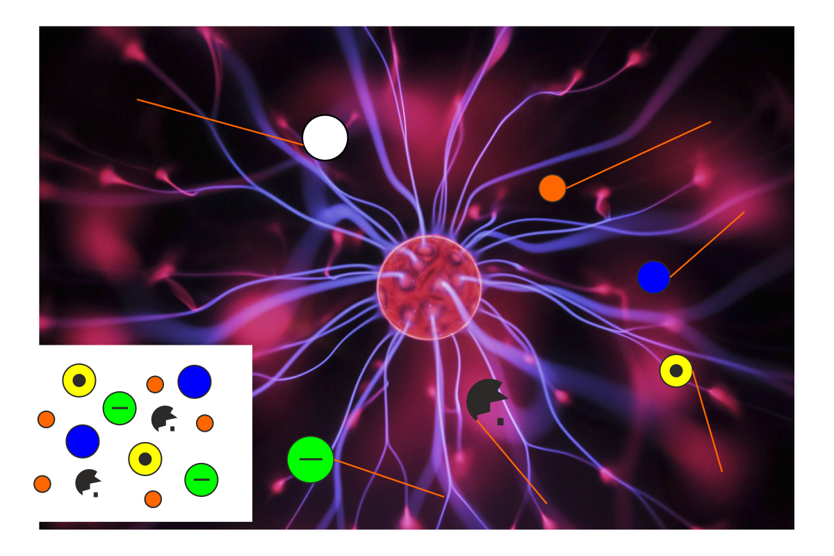 Ilustracja interaktywna przedstawia obraz kuli plazmowej. Na środku znajduje się kula, od której odchodzą linie przypominające rozgałęzione i sterczące we wszystkich kierunkach nitki zakończone fioletowymi płomykami. Na niej narysowane są schematycznie kolorowe koła symbolizujące cząsteczki wchodzące w skład plazmy. Koło białe oznaczone numerem 1, najmniejsze koło pomarańczowe oznaczone numerem 2, koło niebieskie oznaczone numerem 3, koło żółte z czarnym środkiem oznaczone numerem 4, nieregularny czarny kształt oznaczony numerem 5, największe koło zielone ze znakiem minus wewnątrz oznaczone numerem 6. Na ilustracji widoczne są numery, a na nich podpisy. 1. molecule {audio}, 2. free electron {audio}, 3. ion {audio}, 4. excited molecule {audio}, 5. high energy molecule {audio}, 6. ion {audio}.