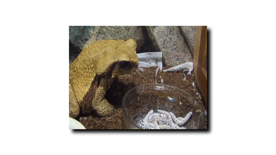 Film przedstawia oliwkową żabę, która próbuje schwytać larwę owada.