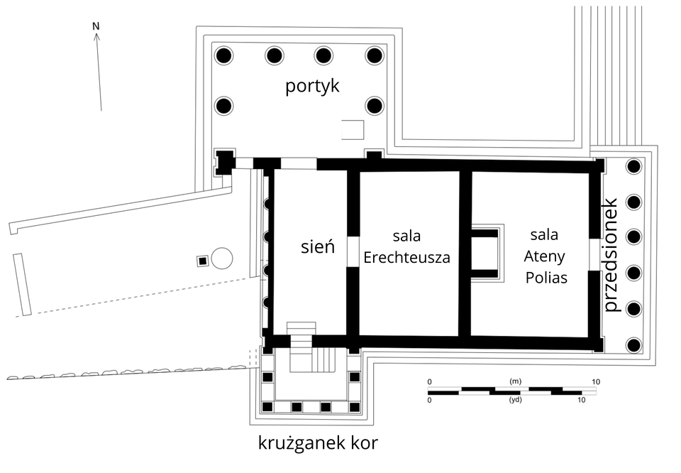 Nietypowy plan wynikał z konieczności pogodzenia wymagań religijnych z uwarunkowaniami terenu. Świątynię wzniesiono na nierównym zboczu, w sąsiedztwie pozostałości starszych budowli oraz miejsc kultu związanych m.in. z Ateną, Zeusem, Posejdonem i legendarnym królem Kekropsem. Budowę przerwała wojna peloponeska, co wymusiło zmiany w projekcie. Powstała świątynia o nieregularnym układzie, z licznymi portykamiportykami i dziedzińcami. Wschód poświęcono Atenie Polias, a zachód – Posejdonowi‑Erechteuszowi, Hefajstosowi i Boutesowi.