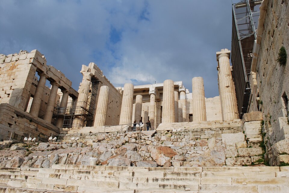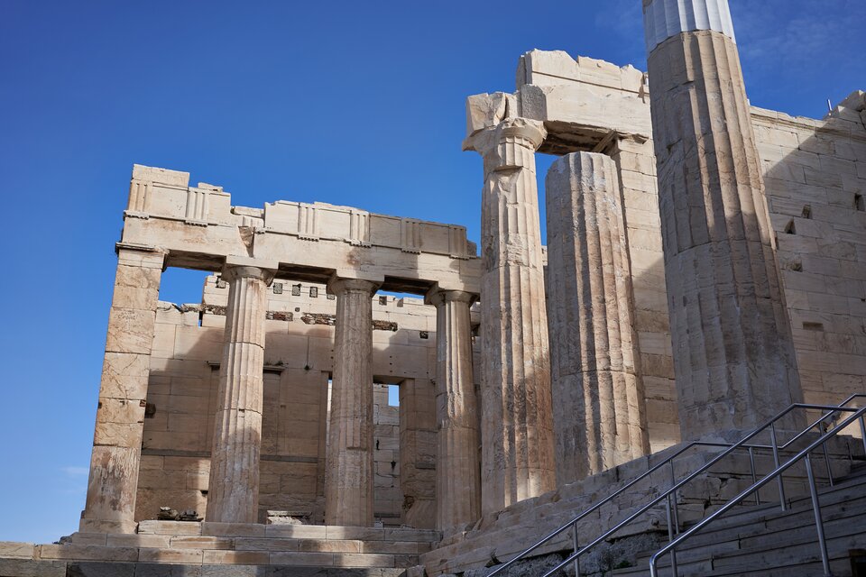 Na Akropol wiedzie szeroki trakt schodów. U wejścia na wzgórze stoją Propyleje, wspaniały portykportyk złożony z kolumnkolumn doryckichdoryckich […]. Piękno Akropolu zdumiewało. Nad miastem wznosiło się wzgórze z monumentalną świątynią, prostą w konstrukcji, niezwykle proporcjonalną i jasną.