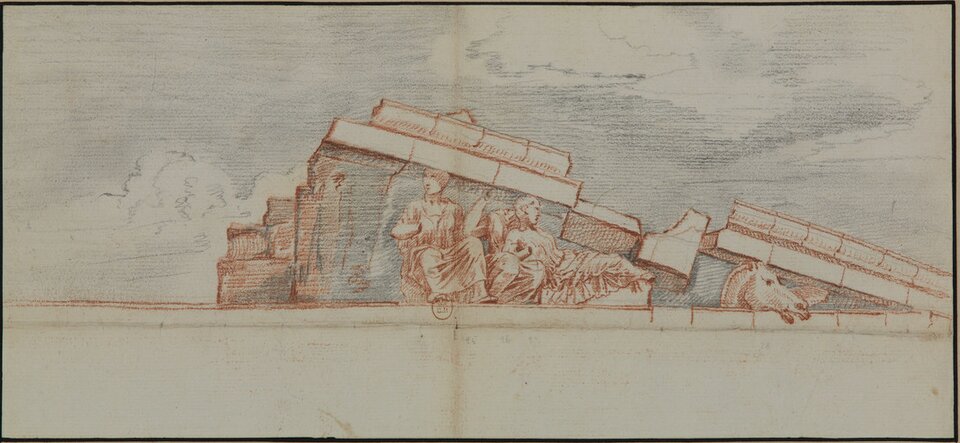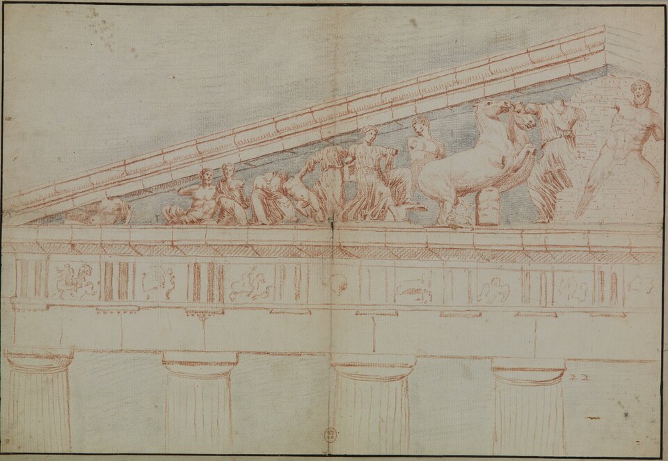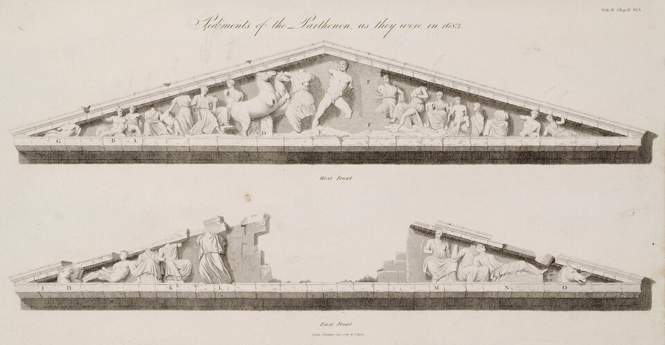 Temat dekoracji znamy dzięki szczegółowemu opisowi pozostawionemu w II wieku n.e. przez Pauzaniasza Periegetesa – pisarza, geografa i podróżnika, który podczas swojej wizyty w Atenach opisał rzeźby frontonówfrontonów Partenonu tak szczegółowo, że można odtworzyć cały układ, chociaż niektóre odczytania mogą budzić niepewność.