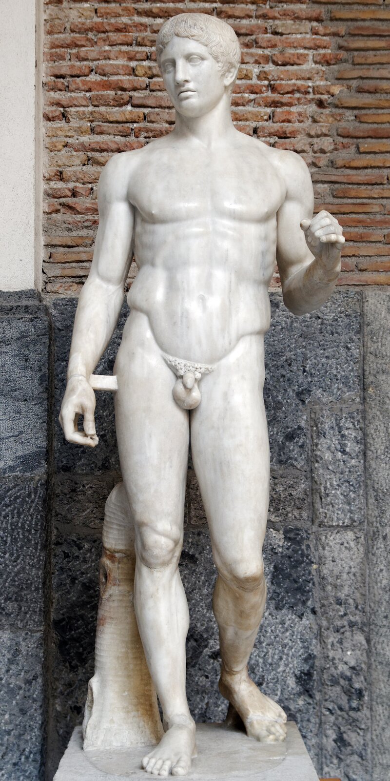 ) to jeden z najsłynniejszych posągów z brązu autorstwa Polikleta. Tworząc go, rzeźbiarz zastosował reguły dotyczące idealnych proporcji człowieka. Rzeźba przedstawia muskularnego mężczyznę, nieco wyższego niż w naturze (2,12 m). KanonKanon Polikleta był oparty na obliczeniach matematycznych. Umowną jednostką miary (modułemmodułem) była tu szerokość palca. Wysokość ciała wynosiła 100 modułówmodułów, stopa stanowiła 1/6 wzrostu – głowa zaś 1/8. Sklepienie klatki piersiowej i miednicy tworzył łuk okręgu, którego środkiem był pępek. Tors natomiast wpisywano w kwadrat. Te miary i wzajemne stosunki części do całości decydowały o harmonii i symetrii wizerunku, jego „szlachetnej prostocie i cichej wielkości”. Wrażenie to pogłębiało zastosowanie zasady kontrapostukontrapostu, czyli naturalnego wyważenia ciała w ruchu. Polegało ono na ustawieniu postaci ludzkiej tak, aby jej ciężar spoczywał na jednej nodze, a lekkie wygięcie tułowia, ugięcie w kolanie drugiej nogi, delikatny skłon głowy i przeciwstawny ruch rąk równoważyły układ całości.