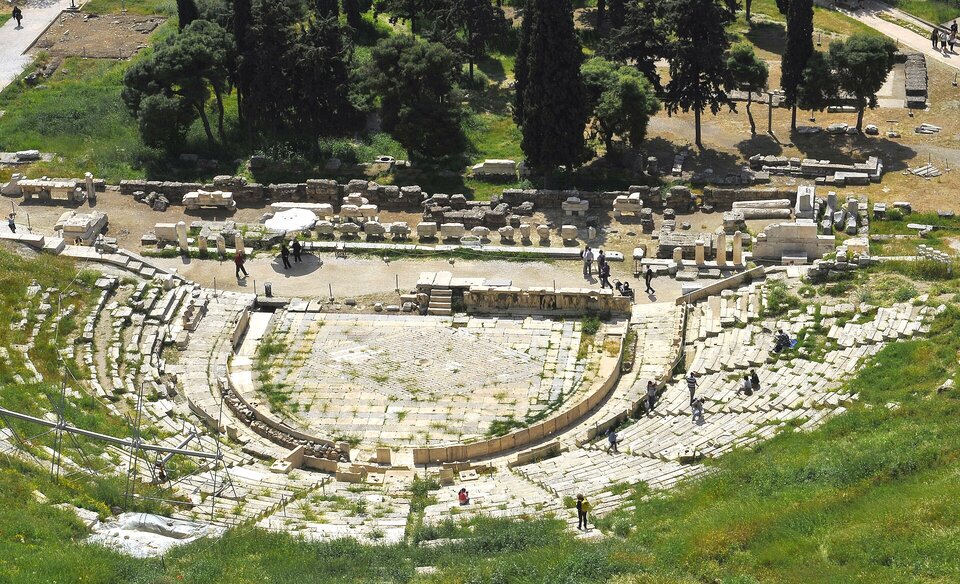 Jednym z najważniejszych osiągnięć starożytnych Greków był teatr. Jego klasyczna forma architektoniczna rozwinęła się od około 420 p.n.e. w Atenach i następnie rozprzestrzeniła się na cały świat grecki. Teatry budowano zwykle na zboczach wzgórz. Na stoku formowano widownię (theatron), z której widzowie mogli obserwować położoną poniżej przestrzeń występów chóru i aktorów (orchestra). Spektakle odbywały się podczas uroczystości ku czci boga Dionizosa i miały charakter święta religijnego. Na orchestrze znajdował się także ołtarz, zwany thymele, poświęcony Dionizosowi.