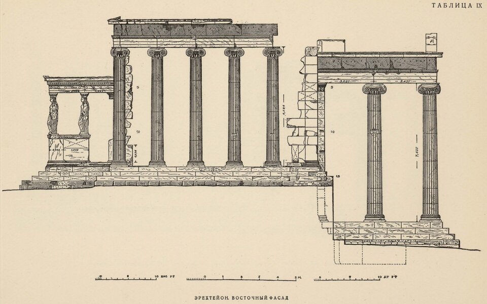Rzymski historyk sztuki Witruwiusz podawał, że kariatydykariatydy przedstawiają kobiety z Kariai, które w czasie wojny stanęły po stronie Persów. Uwiecznione w kamieniu i skierowane w stronę Partenonu, miały stanowić dla przyszłych pokoleń przestrogę i przypomnienie o wierności bogini Atenie i Atenom. Choć autorstwo posągów przypisywano Archimedesowi, precyzja wykonania i siła wyrazu sugerują rękę jego mistrza – Fidiasza. Pierwotnie były prawdopodobnie malowane, podobnie jak niekture detale architektoniczne, co ukazuje poniższa rekonstrukcja