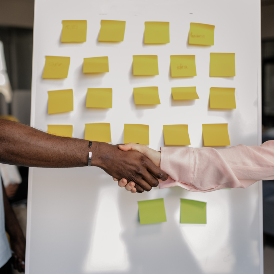 Zdjęcie przedstawia osobę trzymającą w dłoni notatnik. Po prawej stronie logo w kształcie koła, w środku którego znajdują się ikony palety do farb i pędzla.
