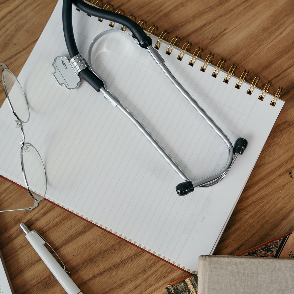 Zdjęcie przedstawia kartkę na podkładce, na której pisze osoba w jednorazowych rękawiczkach. W prawym, górnym rogu piktogram przedstawiający monitor, na którym jest krzywa wykresu elektrokardiografu.