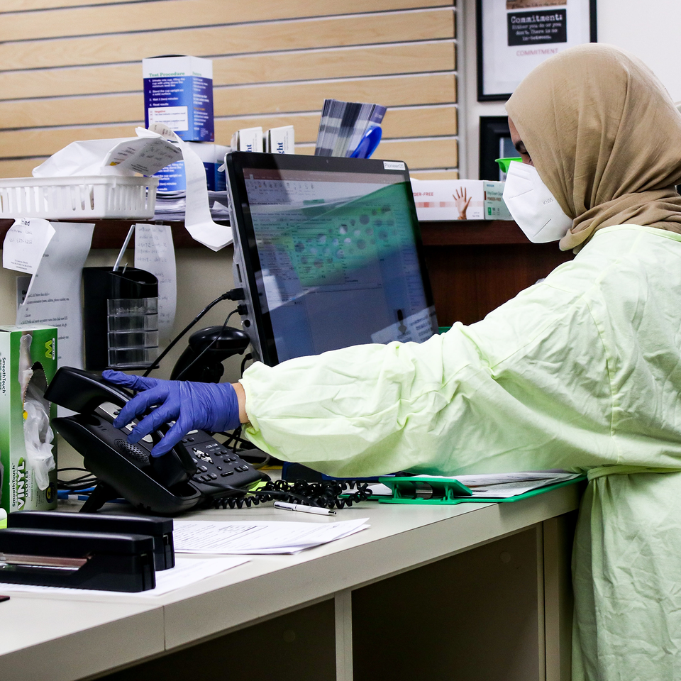 Zdjęcie przedstawia kobietę w maseczce na twarzy na tle półek z kosmetykami i lekami. Po prawej stronie logo w kształcie koła, w środku którego znajduje się ikona buteleczki ze znakiem plus.