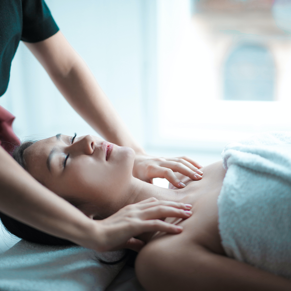Zdjęcie przedstawia twarz kobiety, masażysta trzyma dłonie na jej głowie. Po prawej stronie logo w kształcie koła, w środku którego znajduje się ikona dłoni.