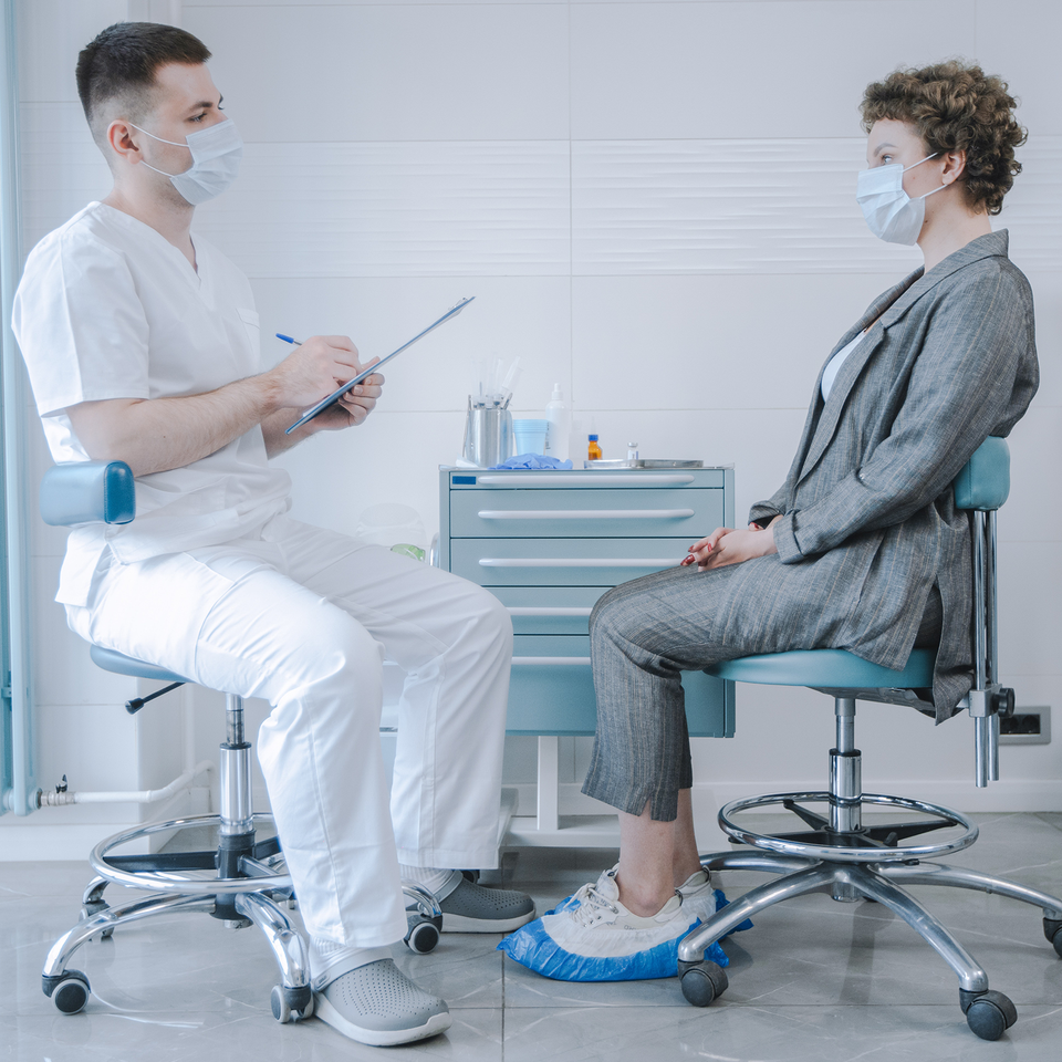 Zdjęcie przedstawia dwie rozmawiające kobiety, zwrócone do siebie twarzami. Po prawej stronie logo w kształcie koła, w środku z ikoną serca i dłoni na nim.