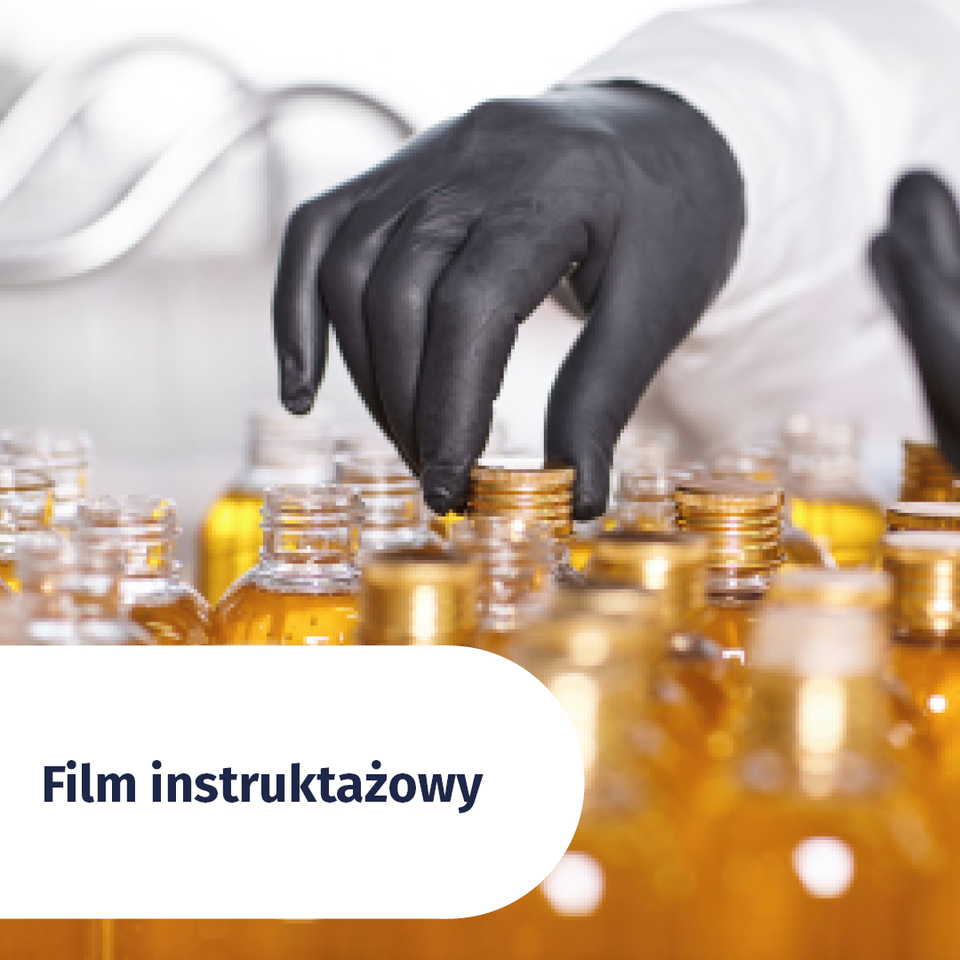 Ilustracja przedstawia technika badającego jakość butelek wypełnionych złotym płynem. Technik ma na sobie biały fartuch i czarne gumowe rękawice.