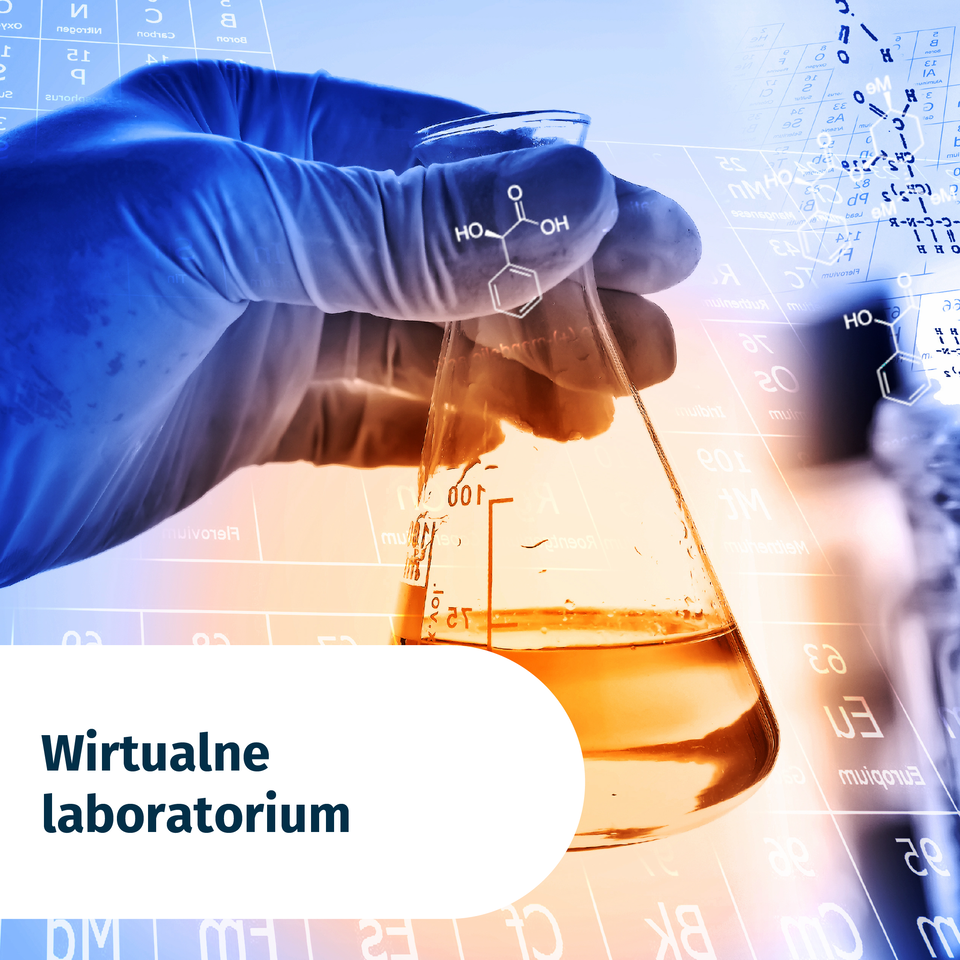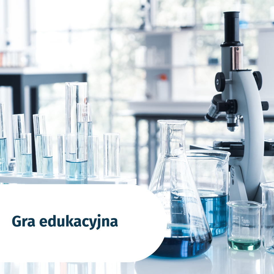 Ilustracja przedstawia laboranta trzymającego w dłoni zlewkę z cieczą o kolorze pomarańczowym, pipetę z której skapuje kropla cieczy do małych próbek i tablicę pierwiastków w tle.