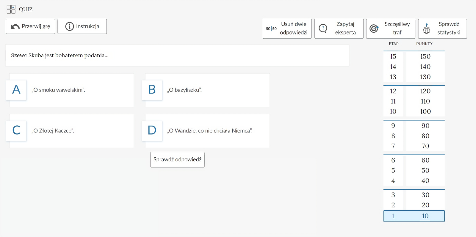 Zaproponuj własne pytanie do gry dotyczące legendy lub podania wraz z jedną prawdziwą i trzema fałszywymi odpowiedziami.