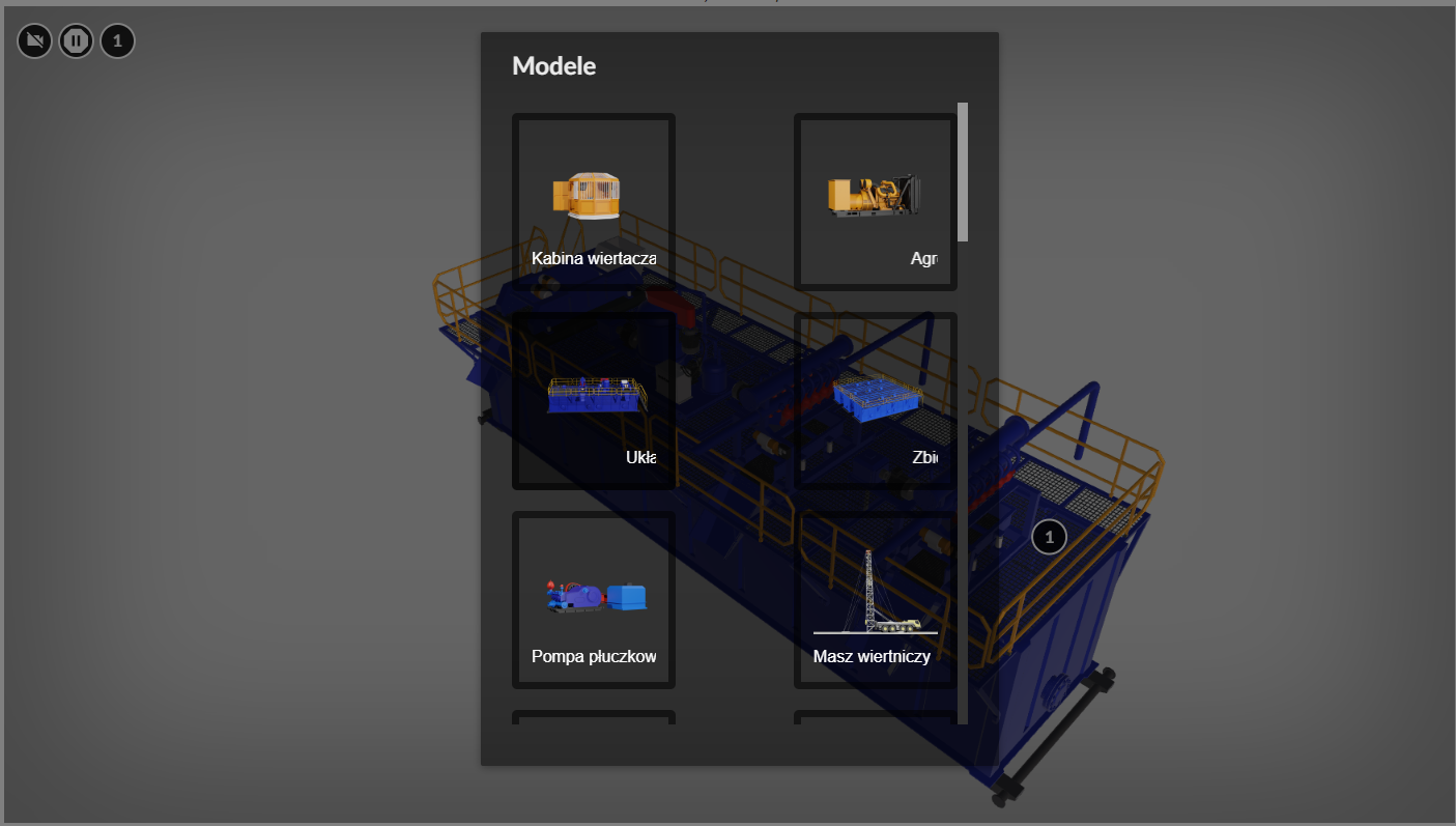 Na ekranie widać animowany interaktywny model wieży wiertniczej.