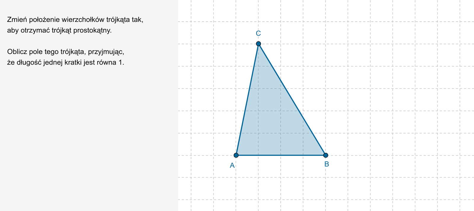 Zmień położenie wierzchołków trójkąta tak, aby otrzymać trójkąt prostokątny. Oblicz pole tego trójkąta, przyjmując, że długość jednej kratki jest równa .
