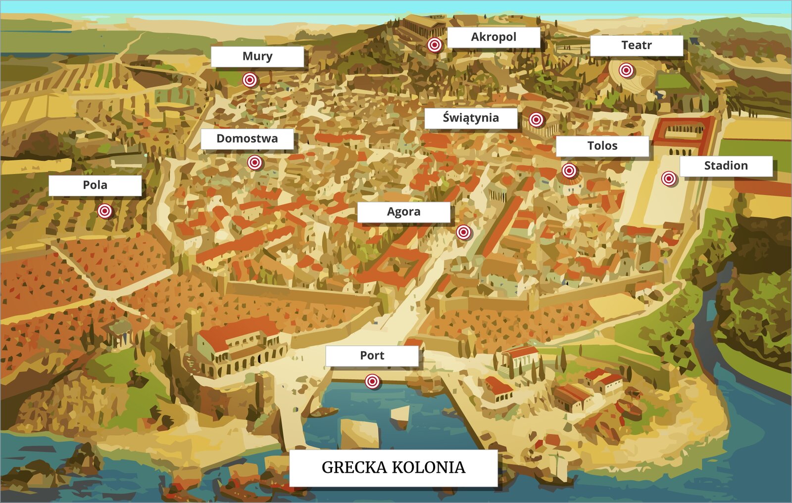 Mapa interaktywna przedstawiająca model greckiej kolonii. Na mapie znajdują się jasne budynki miasta z czerwonawymi dachami. U góry mapy znajduje się wzgórze ze stojącą na nim świątynią. Lasy oraz roślinność zaznaczono na zielono. Na dole namalowano niebieską płaszczyznę wody. Ważne miejsca zostały podpisane oraz zaznaczono czerwono białymi znacznikami. W celu uruchomienia prezentacji należy kliknąć na biały trójkąt, znajdujący się w szarym kółku. Po lewej stronie mapy znajdują się interaktywne punkty z przełącznikami, które pokazują lub chowają dany punkt na mapie. Po kliknięciu na konkretny interaktywny punkt pojawia się informacja na jego temat. Akropol: W Grecji starożytnej było to osiedle lub miasto położone na wzgórzu. W kulturze mykeńskiej (II tys. p. n. e.), akropolis była zamkiem obronnym, który z czasem przekształcił się w ośrodek kultu religijnego (np. w Atenach). Do punktu zostało również dołączone zdjęcie. Fotografia przedstawia widok na ateński akropol, starożytny kompleks budynków wzniesiony na stromym wzgórzu. W centrum fotografii znajduje się Partenon – świątynia poświęcona Atenie Dziewicy (z greckiego parthenos - dziewica) zbudowana z jasnego marmuru, oparta na kolumnach. Zdjęcie wykonane zostało w czasie prac renowacyjnych. Obok Partenonu znajdują się pozostałe budowle akropolu, które także były poddawane renowacji. Fotografia została wykonana od strony parku, w jasny i bezchmurny dzień.Carole Raddato (fotograf), Akropol ateński, okres archaiczny, Ateny, Grecja, źródło: wikimedia.org, CC BY SA 2.0. Teatr: Było to miejsce, gdzie ku czci boga Dionizosa wystawiano sztuki teatralne. Od piątego wieku p.n.e. do kanonu na długie lata weszły trzy tragedie, trzy komedie i jeden dramat satyrowy. Początkowo chóry, z których miała powstać tragedia, występowały na placach, na gładko ubitej lub wybrukowanej ziemi, tańcząc dookoła ołtarza Dionizosa, z trzech stron zaś placu urządzano dla widzów rodzaj drewnianych trybun. Najstarsze z zachowanych resztek monumentalnych greckich budowli teatralnych sięgają VI w. p.n.e. (w Thorikos w Attyce). Do punktu zostało również dołączone zdjęcie. Fotografia przedstawia teatr grecki. W centrum teatru znajdują się turyści. Zdjęcie zostało wykonane na tle gór. Leonid Svetkov (fotograf), Teatr grecki, Delfy, Grecja, źródło: wikimedia.org, CC BY SA 2.5. Stadion: Budowla w kształcie podkowy, z amfiteatralnie wznoszącą się widownią, wyposażona w tor wyścigowy; miejsce odbywania się zawodów lekkoatletycznych. Poza najsłynniejszym w starożytności stadionem w Olimpii przeznaczonym na 45000 widzów, na którym mogło startować 20 zawodników znane są stadiony w Atenach, Delfach, Epidauros i w Efezie. Do punktu zostało również dołączone zdjęcie. Na fotografii przedstawiono część stadionu greckiego, znajdującego się w Olimpii. Fotografia ukazuje dwie kamienne ściany, pomiędzy którymi biegnie ścieżka, prowadząca na dużą, otwartą przestrzeń. Tło stanowi góra znajdująca się w oddali. Jean Housen (fotograf) Stadion grecki, VI w. p.n.e., Olimpia, Grecja, źródło: wikimedia.org, CC BY 3.0. Agora: W miastach greckich centralnie położony plac - rynek najczęściej czworokątny, na którym koncentrowało się życie polityczne i znajdowały najważniejsze miejsca kultu. Agora archaiczna charakteryzowała się ulicą przebiegającą przez środek placu, której wylot wypadał między dwoma portykami. Jednym z najsłynniejszych rynków w starożytności była agora ateńska. Wznosił się tam buleuterion, ołtarze i budowle, które rozsławiły imię Aten, takie jak Stoa Poikile z freskami Polignota i Mikona. Do punktu zostało również dołączone zdjęcie. Fotografia przedstawi ruiny agory w Atenach. W centrum zdjęcia znajduje się plac, dookoła którego umieszczone są ruiny kolumn. Tło stanowią budynki. Ruiny agory w Atenach, VI w. p.n.e., Ateny, Grecja, źródło: wikimedia.org, CC BY SA 3.0. Port: Grecy dostosowywali naturalne ukształtowanie terenu, tworząc często porty w zatokach z naturalnymi cyplami osłaniającymi statki i zabudowania portowe przed wiatrem i falami. W dużych portach, jak Pireus, znajdowały się stocznie, gdzie budowano statki, magazyny do przechowywania towarów, sklepy i inne punkty usługowe. W części stacjonowania floty budowano specjalne szopy, gdzie dokonywano drobnych napraw potężnych trirem. Do punktu został dołączony obraz przedstawiający port grecki. Na pierwszym planie znajduje się morze z zacumowanymi do portu statkami. W tle znajdują się budynki i pola, a w oddali zaś góry. John Steeple Davis Pireus i mury Aten, 1900 r., [w:] "The story of the greatest nations, from the dawn of history to the twentieth century", Nowy Jork 1900 r., źródło: wikimedia.org, domena publiczna. Świątynia: W pojęciu starożytnych Greków była domem bóstwa. Mieściła posąg kultowy, przybory liturgiczne, niekiedy skarbczyk lub skarb miasta. Wierni gromadzili się przed świątynią, nie wchodząc do wnętrza, stąd niewielkie rozmiary świątyń i skromna dekoracja wnętrza, zaś rozbudowana i bogato dekorowana strona zewnętrzna. Kamienna świątynia grecka wykształciła się w VII/VI w. p.n.e. z drewnianego megaronu. Do punktu zostało dołączone zdjęcie. Przedstawia ono Świątynię Hery w Paestum. Jest to duża budowla zbudowana z pionowo ustawionych kolumn, znajdująca się na otwartej przestrzeni. W tle rosną drzewa. Norbert Nagel (fotograf), Światynia Hery w Paestum, VI w. p.n.e., Kampania, Włochy, źródło: wikimedia.org, CC BY SA 3.0. Tolos: W architekturze greckiej była to budowla na planie koła, często z dookolną kolumnadą, zwieńczona stożkowym dachem przypominającym kopułę. Do punktu zostało dołączone zdjęcie z tolosem w Delfach. Ukazane zostały ruiny budowli: część