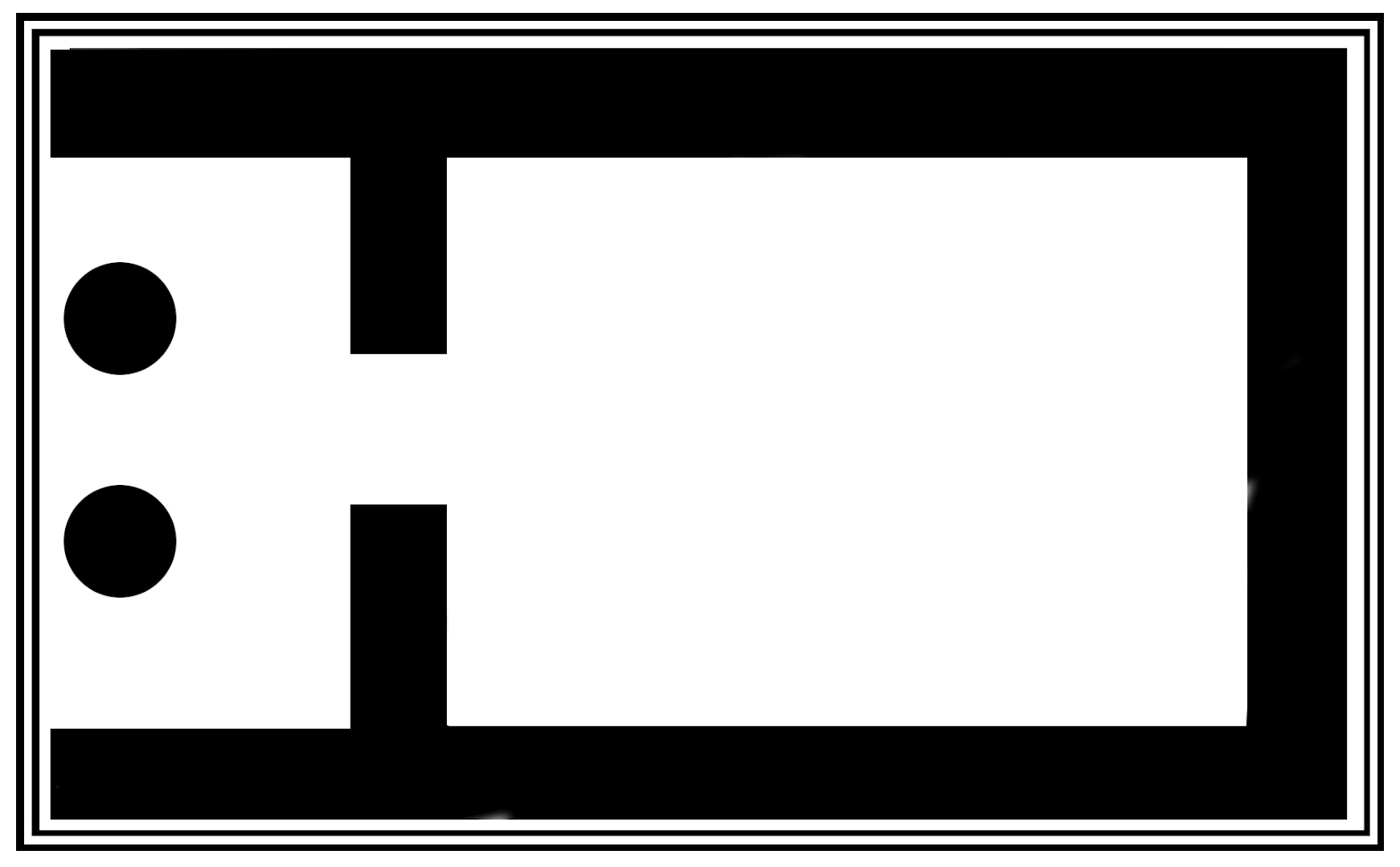 6. slajd – Na ilustracji znajduje się schemat świątyni greckiej w antach. Jest to rysunek prostokąta w poziomie, w którym jest wpisany kolejny prostokąt w bardzo bliskiej odległości – w ten sposób zaznaczone są schody, które otaczają budynek ze wszystkich stron i informuj o tym, że cały budynek jest umieszczony na podeście. Świątynia składa się z jednego pomieszczenia, do którego prowadzi wejście z przedsionka. Przedsionek jest niewielkich rozmiarów, po jego obydwu stronach znajdują się ściany, a między nimi – dwie kolumny, które na planie zaznaczone są ciemnymi, wypełnionymi okręgami.