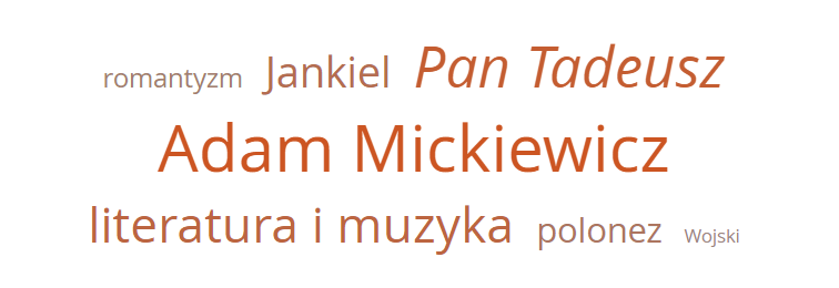 Zapoznaj się z poniższymi słowami kluczami związanymi z lekcją, a następnie zaproponuj ich własną kolejność. Możesz kierować się tym, co cię zaciekawiło, poruszyło, zaskoczyło itp. Przygotuj krótkie uzasadnienie swojej propozycji. Słowa klucze: Adam Mickiewicz, Pan Tadeusz, literatura i muzyka, Jankiel, polonez, romantyzm, Wojski.