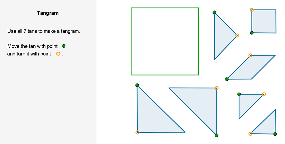 Aplet geogebry: Aplet przedstawia tangram – układankę składającą się z siedmiu części. Poniżej znajduje się galeria ilustracji stanowiących alternatywę dla apletu.