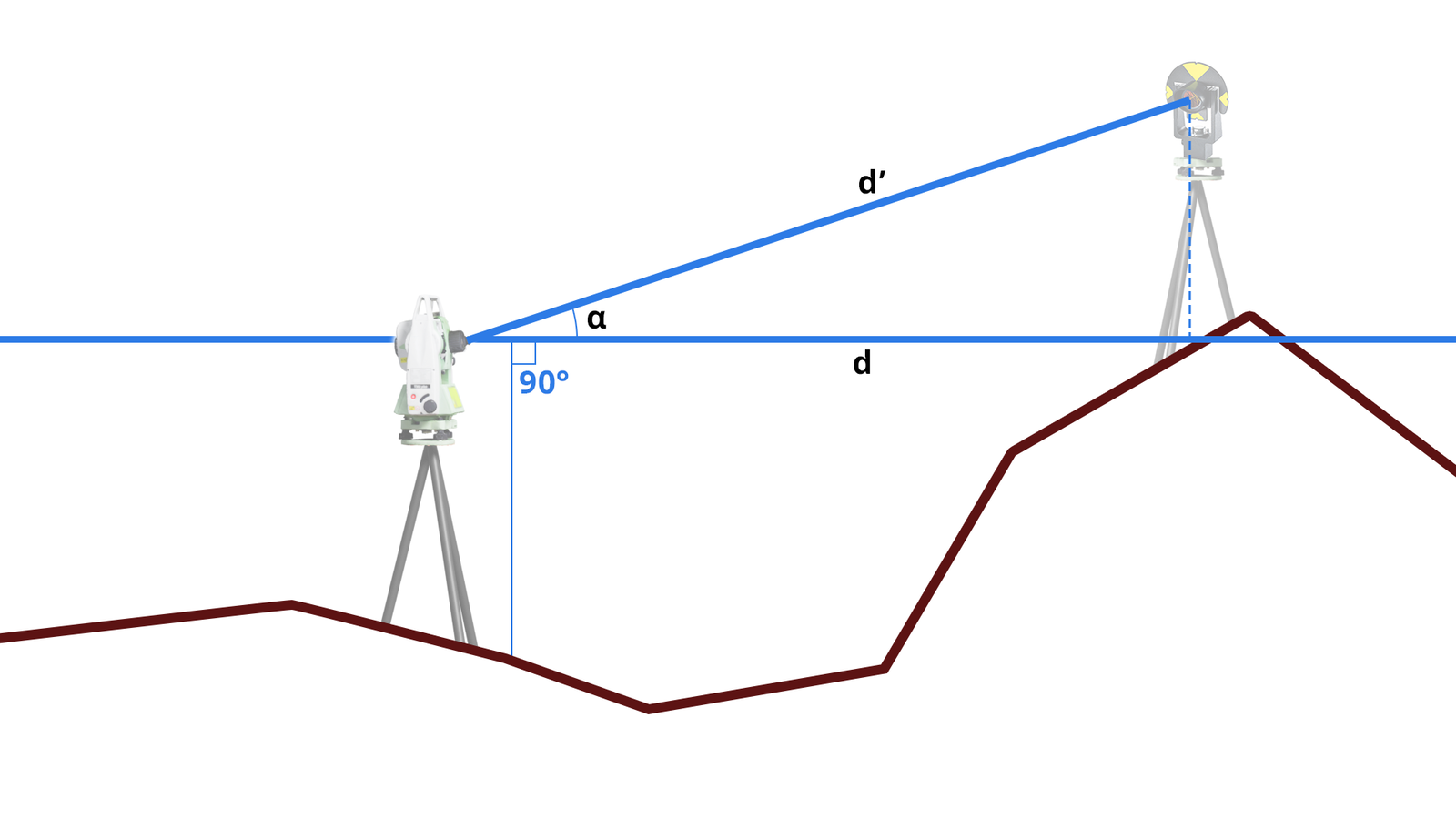 6. Schemat pomiaru odległości skośnej i redukcji do odległości poziomej przy użyciu dalmierza elektromagnetycznego6. Schemat pomiaru odległości skośnej i redukcji do odległości poziomej przy użyciu dalmierza elektromagnetycznego