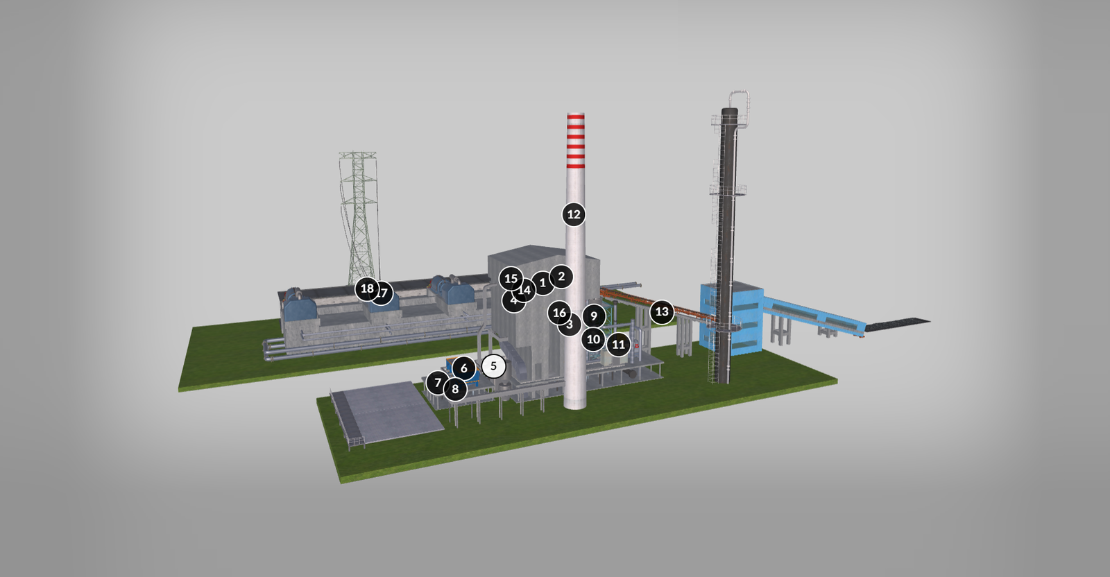 Drugi przycisk: Elektrownia z turbiną parową oraz kotłem opalanym paliwem stałym i wybrane pomiary.
