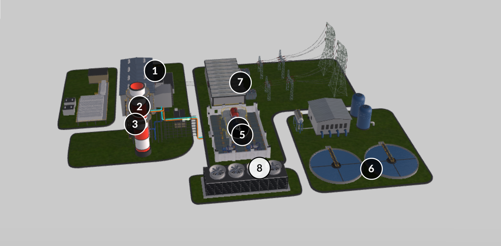 Pierwsza ilustracja to elektrociepłownia z turbiną parową i kotłem opalanym paliwem stałym. Składają się na nią dwa budynki połączone rurami. W pierwszym bardziej płaskim budynku znajdują się cylindrycznego kształtu, poziomo, cztery pojemniki i budynek jest połączony z linią energetyczną, w drugim nieco wyższym budynku znajdują się taśmy przenoszące materiał oraz komin.