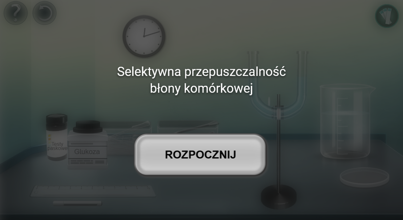 W wirtualnym laboratorium na stole stoją różne odczynniki i przyrządy. Po kliknięciu na łyżeczkę unosi się ona i wędruje do pojemnika z glukozą. Na łyżeczkę nabierana jest niewielka ilość glukozy. Następnie należy ją przenieść do U‑rurki wyglądającej jak duża litera U wsparta na krótkiej pionowej podstawce. Glukozę wsypuje się do jednego z ramion rurki. Glukoza opada w dół aż do miejsca, w którym oba ramiona U‑rurki stykają się ze sobą. Rozdziela je niewielka pionowa błona. Po wsypaniu glukozy klika się na leżący na stole marker, który przemieszcza się do U‑rurki i zaznacza obu jej ramionach po jednej poziomej linii na granicy cieczy i powietrza. Na koniec z innego pojemnika pobierane są dwa paski do sprawdzania stężenia glukozy. Każdy z nich jednocześnie zanurza się w jednym z ramion. Następnie paski unoszą się w górę. Pasek, który był zamoczony w roztworze glukozy, zmienia kolor z zielonego na czerwony. Ten, który był zamoczony w sąsiadującym ramieniu, pozostaje zielony. Następnie widać, jak na okrągłym zegarze wiszącym na ścianie przesuwają się wskazówki tak, że mija godzina. Po upływie godziny w jednym z ramion U‑rurki słup cieczy jest niższy, a w drugim wyższy. Poziom cieczy w ramieniu, w którym znajduje się glukoza, jest powyżej pierwotnego poziomu wody - słup cieczy jest wyraźnie wyżej niż kreska narysowana godzinę wcześniej markerem.