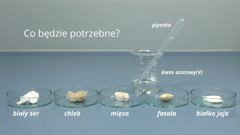 Film przedstawia wykrywanie białka w produktach spożywczych.