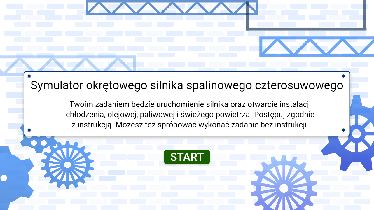 Zadaniem, które należy wykonać w symulatorze, jest otwarcie wszystkich instalacji poprzez otwieranie różnych zaworów i uruchamianie pomp lub wirówek, a następnie uruchomienie silnika.