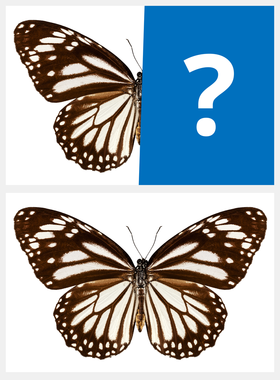 Ilustracja interaktywna jest podzielona na dwie części. Przedstawia połowę motyla wykonanego w sepii. Drugą część zajmuje niebieski prostokąt ze znakiem zapytania. Po odwróceniu ilustracji zostaje zaprezentowana praca, ukazująca tego motyla w całości. Owad jest symetryczny.