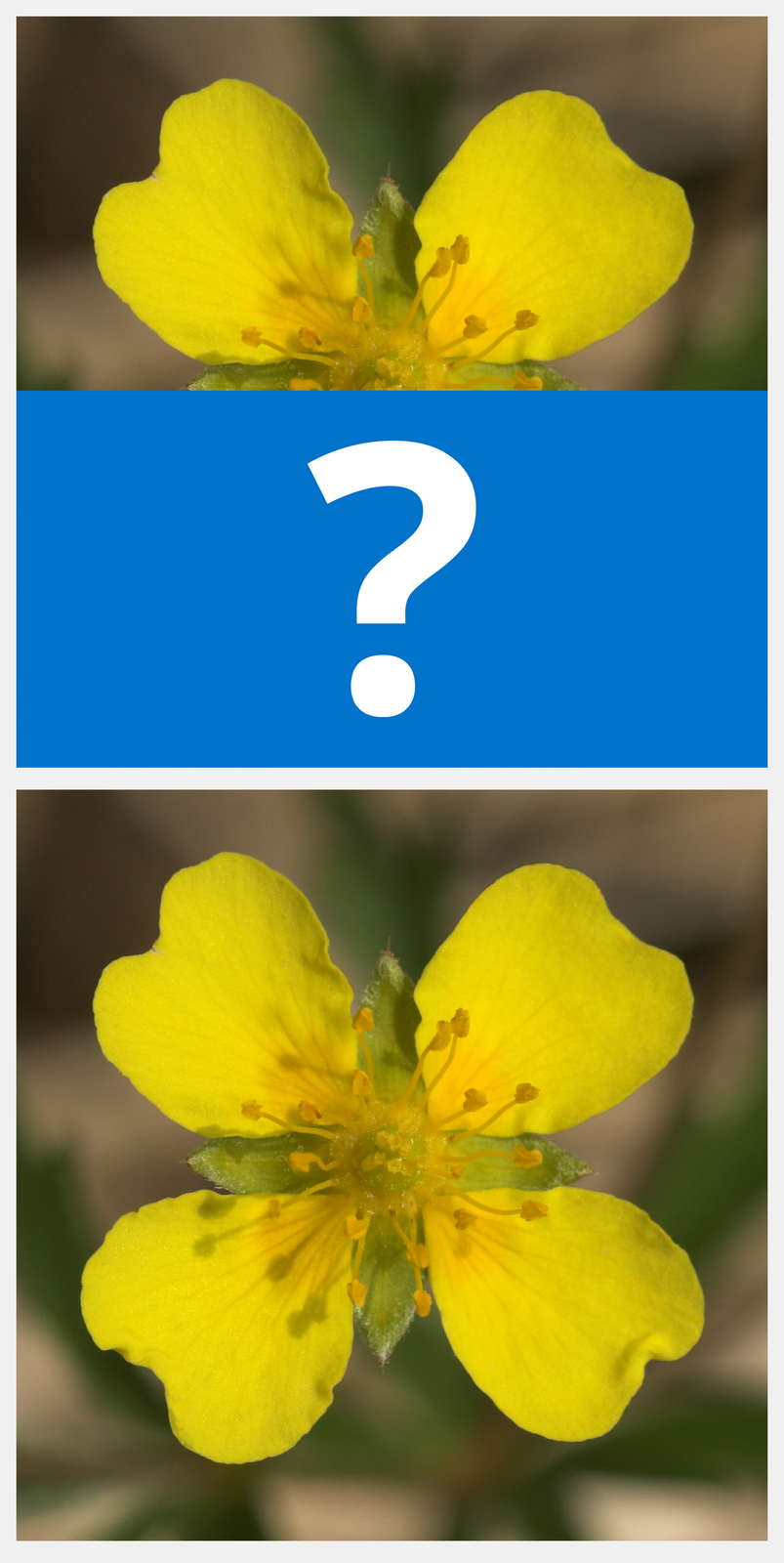 Ilustracja interaktywna jest podzielona na dwie części. Górna przedstawia dwa żółte płatki kwiatu, czyli jego połowę. W środku wyrastają żółte pręciki. Tło jest rozmazane. Drugą część zajmuje niebieski prostokąt ze znakiem zapytania. Po odwróceniu ilustracji ukazany jest cały kwiat o symetrycznym układzie płatków i tych samych cechach.
