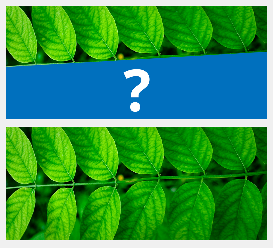 Ilustracja interaktywna jest podzielona na dwie części. Przedstawia w górnej części połowę gałązki z liśćmi, ułożonymi w szeregu. Liście są w kolorze intensywnej zieleni, z widocznymi żyłkami. Drugą, dolną część zajmuje niebieski prostokąt ze znakiem zapytania. Po odwróceniu ilustracji ukazana jest cała gałązka z liśćmi o układzie symetrycznym i tych samych właściwościach.