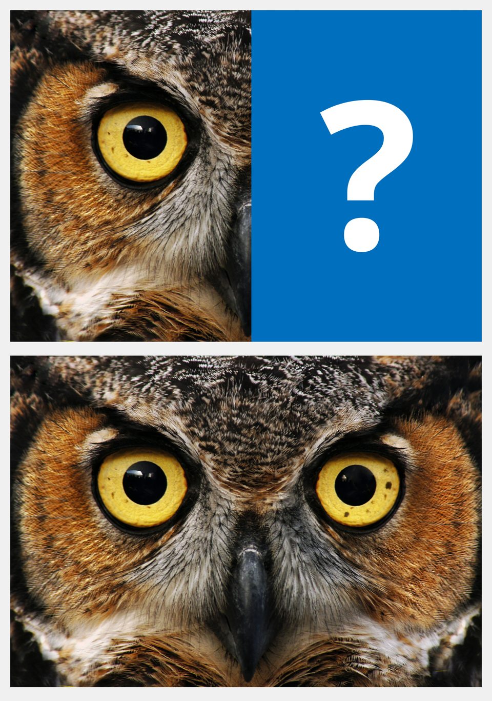 Ilustracja interaktywna jest podzielona na dwie części. Przedstawia połowę głowy sowy. Ma szeroko otwarte, duże oko o żółtym kolorze. Jej upierzenie zabarwione jest na różne odcienie brązu. Drugą część zajmuje niebieski prostokąt ze znakiem zapytania. Po odwróceniu ilustracji ukazana jest cała głowa sowy o symetrycznym układzie - z dużymi, szeroko otwartymi, żółtymi oczami.