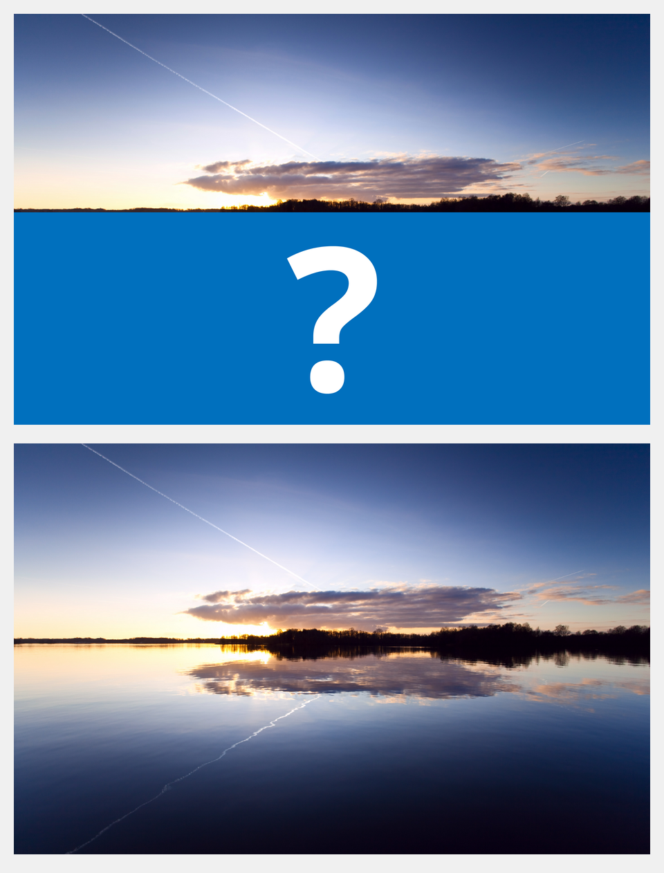 Ilustracja interaktywna jest podzielona na dwie części. Przedstawia połowę pejzażu z niebem, chmurami i fragmentem pejzażu. Drugą część zajmuje niebieski prostokąt ze znakiem zapytania. Po odwróceniu ilustracji ukazany jest cały pejzaż, którego górna część symetrycznie odbija się w tafli wody.