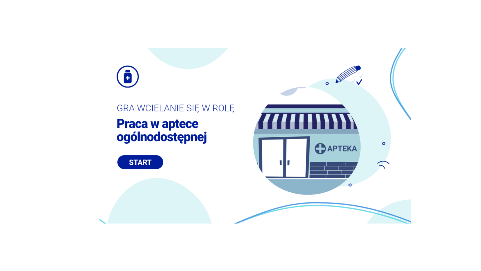 Gra wcielanie się w rolę “Praca w aptece ogólnodostępnej” rozpoczyna się ekranem startowym. Klikając przycisk Start, gracz przechodzi do celów i zasad gry. Między tymi ekranami przechodzi się, klikając przycisk Dalej lub Wstecz.