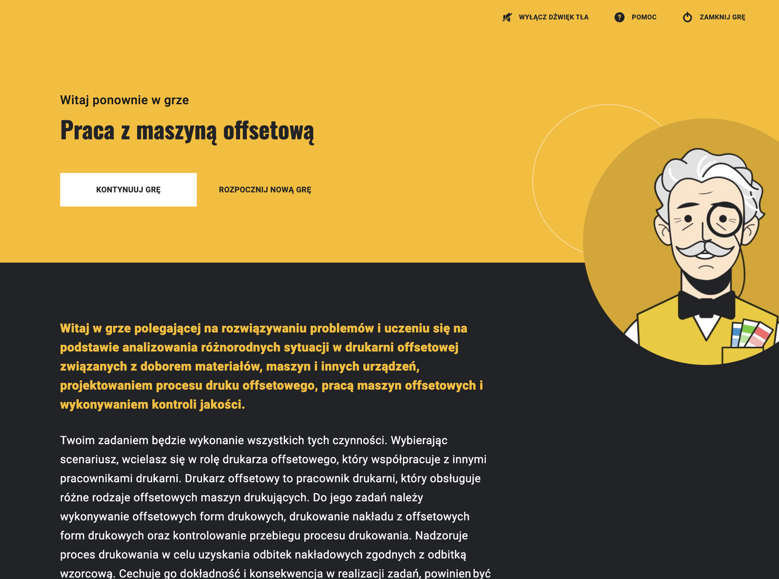 W górnej części ekranu gry, po lewej stronie znajduje się pasek postępu. Po rozwiązaniu kolejnych zadań można monitorować poziom postępu w grze, liczbę zdobytych punktów oraz odznak. Po prawej stronie, w górnej części ekranu znajdują się interaktywne przyciski. Pomoc pozwala przejść do działu „Pytania i odpowiedzi”. Przycisk „Zamknij grę” pozwala na wyjście z gry.