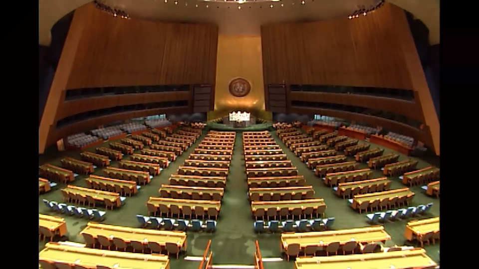 Film przedstawia dużą salę, w której stoły ustawione są równolegle, a krzesła skierowane są w kierunku podestu. Na wprost widoczne jest podwyższenie, na którym stoi stół. Z tyłu, na ścianie, znajduje się symbol ONZ. Ściany sali wykonane są z drewna.