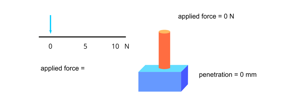 Ilustracja przedstawia schematycznie doświadczenie prezentujące wpływ zmiennej siły na tę samą powierzchnię. Po lewej stronie poziomą linię opisaną od lewej 0, 5, 10 N, poniżej applied force równa się. Na linię w miejscu opisanym 0 wskazuje strzałka pionowa skierowana w dół, symbolizująca, że na cylinder nie działa żadna siła. Po prawej stronie ilustracji prostopadłościan, symbolizujący piasek, opisany penetration równa się 0 mm. Na nim pionowo narysowany walec opisany applied force równa się 0 N.