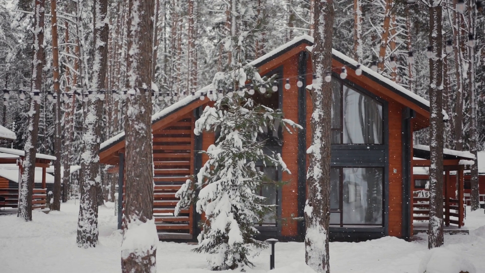 Drewniany dom ze spadzistym dachem i dużymi, balkonowymi oknami stoi pośrodku lasu. Delikatne opady śniegu przyprószyły drzewa, dach i ganek wejściowy.