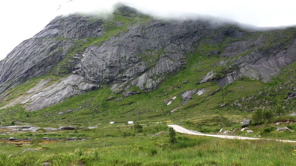 Zbocze czarnej, wulkanicznej góry porośnięte zielenią. Po wijącej się w dole wąskiej drodze jadą kampery.