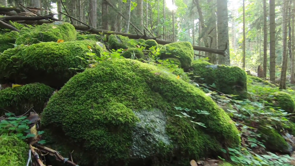 Środek lasu, gdzie leżą głazy porośnięte mchem a na nich stare, powalone drzewa.