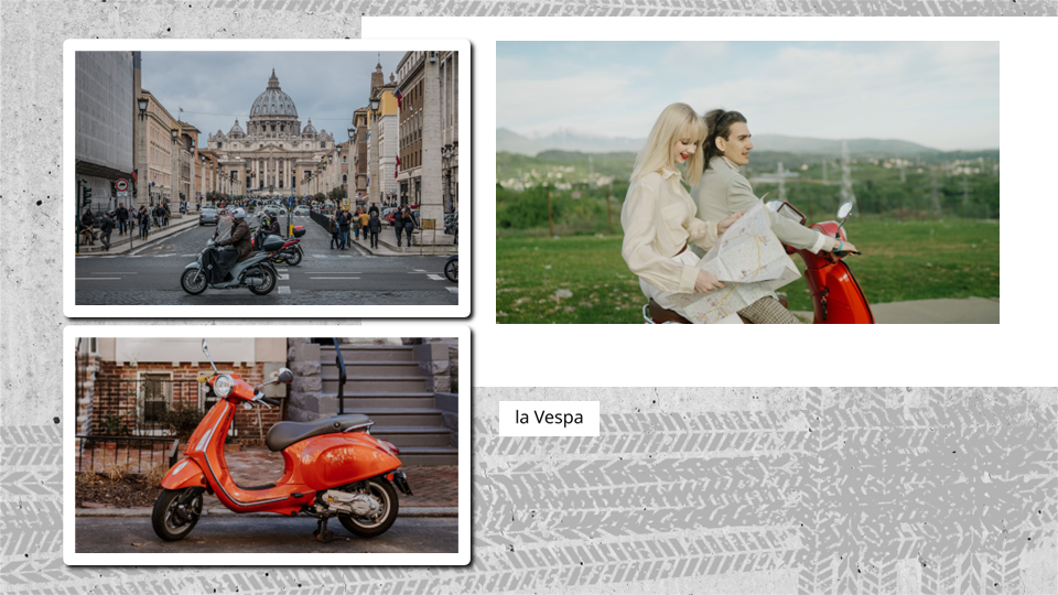 la Vespa | Slajd składa się z dwóch zdjęć i krótkiego filmu. Na pierwszym zdjęciu widać ludzi przejeżdżających na skuterach włoską ulicą. Drugie zdjęcie przedstawia skuter zaparkowany przed domem. Film przedstawia chłopaka i dziewczynę na skuterze, dziewczyna rozkłada mapę. Na slajdzie znajduje się napis z nazwą tego środka transportu. | La Vespa è un’icona dell’italianità. |
