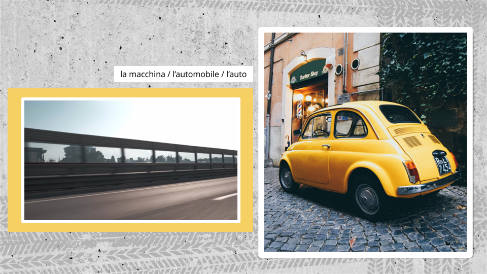 la macchina/l’automobile/l’auto | Slajd przedstawia krótki film i zdjęcie. Po lewej na filmie widać jadący sportowy samochód. Zdjęcie po prawej przedstawia starego słynnego Fiata 500. Na slajdzie znajdują się też napisy określające ten rodzaj transportu. | Sono macchine italiane per esempio: la Fiat, la Lamborghini, l’Alfa Romeo e la famosa Ferrari. |
