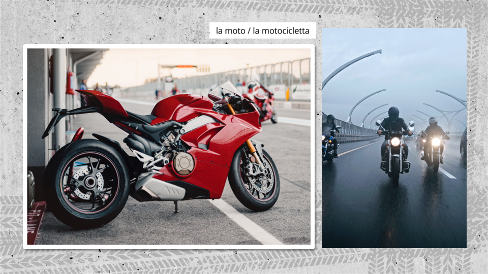 la moto/la motocicletta | Slajd składa się ze zdjęcia i krótkiego filmu. Zdjęcie po lewej przedstawia zaparkowany motocykl typu ścigacz. Film przedstawia grupę motocyklistów jadących w czasie deszczu drogą. Na slajdzie znajduje się napis z nazwami tego środka transportu. | La motocicletta è grande e rumorosa. |