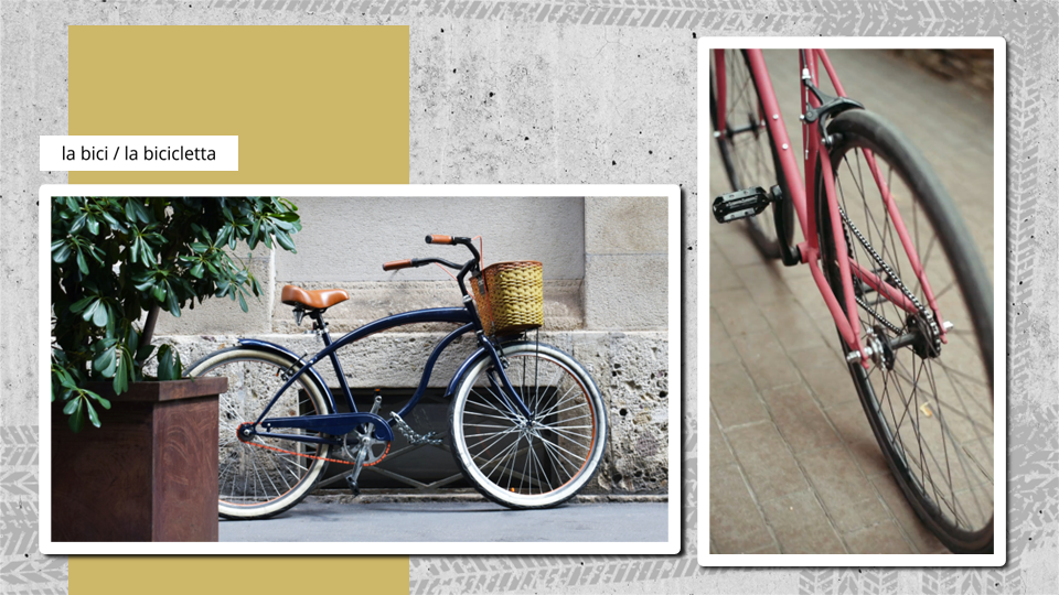la bici/la bicicletta | Slajd składa się ze zdjęcia i krótkiego filmu. Zdjęcie po lewej przedstawia rower z koszykiem na kierownic oparty o fasadę domu. Po prawej znajduje się film przedstawiający zbliżenie na obracające się koła prowadzonego roweru.. Na slajdzie znajdują się napisy z nazwami tego środka transportu. | La bici è un mezzo di trasporto molto comodo ed ecologico. |