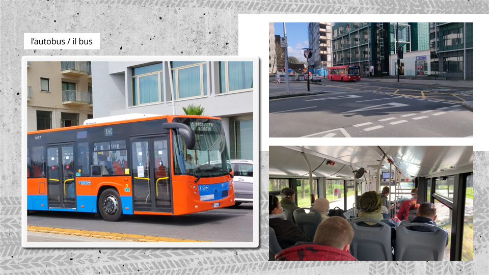 l’autobus/il bus | Slajd składa się z dwóch krótkich filmów i zdjęcia. Zdjęcie po lewej przedstawia autobus miejski. Na pierwszym filmie po prawej widać przejeżdżający ulicą autobus. Drugi film przedstawia ludzi jadących we wnętrzu autobusu. Na slajdzie znajdują się napisy z nazwami tego środka transportu. | Gli autobus in città sono spesso molto affollati. |